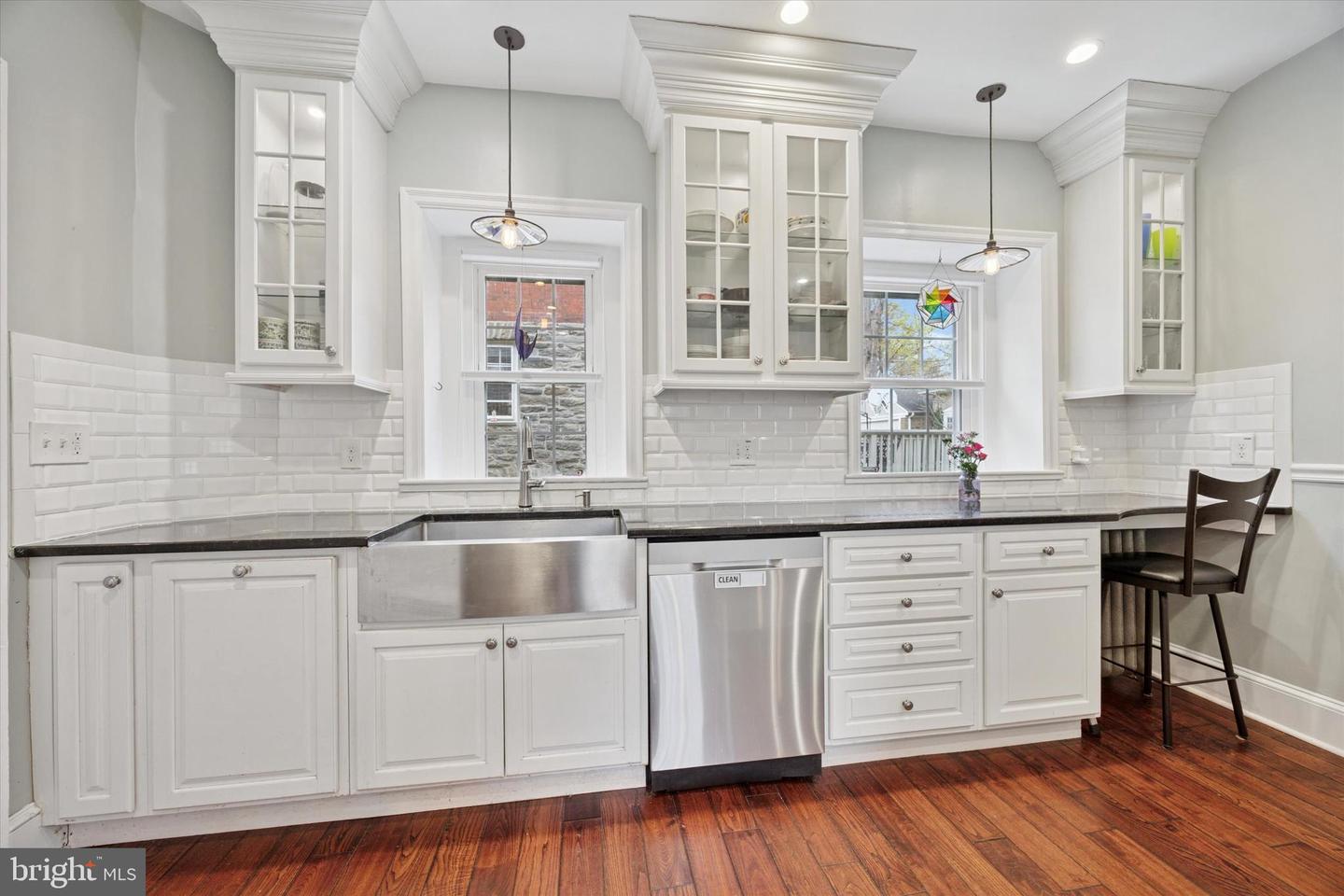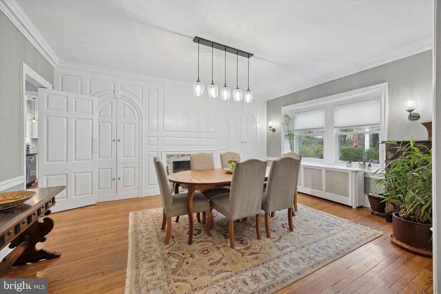 As you enter, a spacious center hall welcomes you, leading to generously sized rooms bathed in natural sunlight, thanks to the home's elevated position. The inviting wrap-around porch, complete with a ceiling fan, sets the perfect scene for relaxing afternoons. Inside, you'll find three stunning fireplaces, exquisite paneling, and beautifully refinished oak and pumpkin pine floors. Classic dining room pocket doors and two staircases enhance the home's unique character and functionality. The formal living room showcases a marble fireplace and newer elegant French doors that open onto the covered porch, creating a seamless indoor-outdoor flow. The dining room is stunning and boasts a marble fireplace, intricate crown moldings, and custom built-in cabinetry, adding to its refined ambiance. A well-appointed butler's pantry with a wet bar, newer beverage refrigerator, and granite counters provides ample space for entertaining, storage, and meal prep. The oversized, sunlit eat-in kitchen is ideal for both casual meals and hosting gatherings, with plenty of space for multiple cooks. All appliance have been replaced within the last two years. You will be impressed by the abundance of prep space, two full sized sinks, gas stove with hood, wood milled cabinetry, and a combination of granite and butcher block counters. The breakfast bar and eat in area give you many dining options. There is direct access to the garden and grilling area making outdoor dining a breeze. The kitchen also includes a conveniently located laundry closet with washer and dryer. Just off the kitchen, a powder room adds convenience for today's living. The second floor features three to four bedrooms and two full baths. The enchanting primary bedroom exudes charm. A timeless stone fireplace serves as a cozy centerpiece here, and French doors open to a deck overlooking your private green space.Three additional bedrooms share a bath, with one offering an ensuite bathroom for added privacy. The third floor is a flexible space, perfect for today's lifestyles. It includes two additional large bedrooms, a workout room, and two full baths making it ideal for guests, a home office, or a creative retreat. The full, unfinished basement offers all of the storage you have dreamed about. The fenced-in backyard impresses with mature plantings, perennial flowers and a storage shed. Other updates include a leaf gutter protection system, replaced bilco doors, newer hot water heater , and a water filtration installed in butler's pantry. Ideal location with easy access to Lincoln Drive and a short walk to SEPTA. Walk to Weavers Way, High Point Cafe, Carpenter's Woods, and all West Mt airy has to offer!